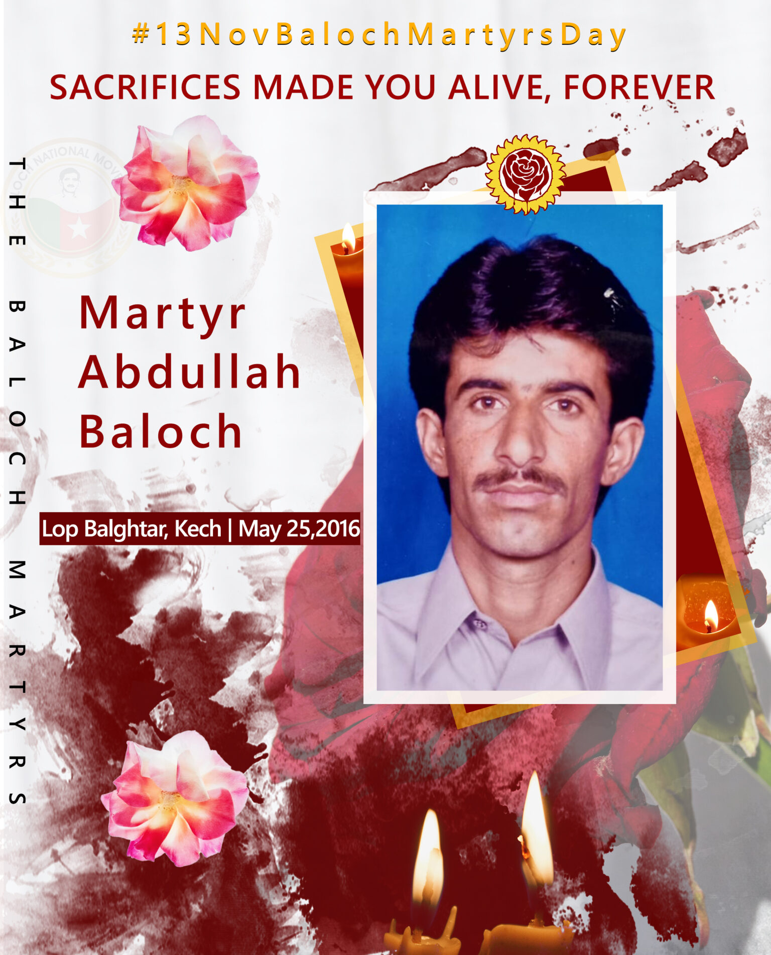 13 Nov Baloch Martyrs DayBLAMayPostersMartyr Abdullah Baloch Last updated: November 12, 2023 9:26 am BNM Share 0 Min Read Martr Abdullah Baloch SHARE Sacrifices Made You Alive, Forever.Resident of Lop Balgtar, area of KechDate of Martyrdom: May 25, 2016 Martyr General Aslam Baloch Martyr Zaheer Baloch Martyr Khalid Hasil Baloch Martyr Balach Baloch Martyr Shoaib Baloch TAGGED:#13NovBalochMartyrsDay#Balochistan#BalochMartyrs#Kech Share This Article Facebook Whatsapp Whatsapp Telegram Email Copy Link Print Leave a Comment Leave a Comment Leave a ReplyYour email address will not be published. Required fields are marked *Comment *Name Email Website Δ