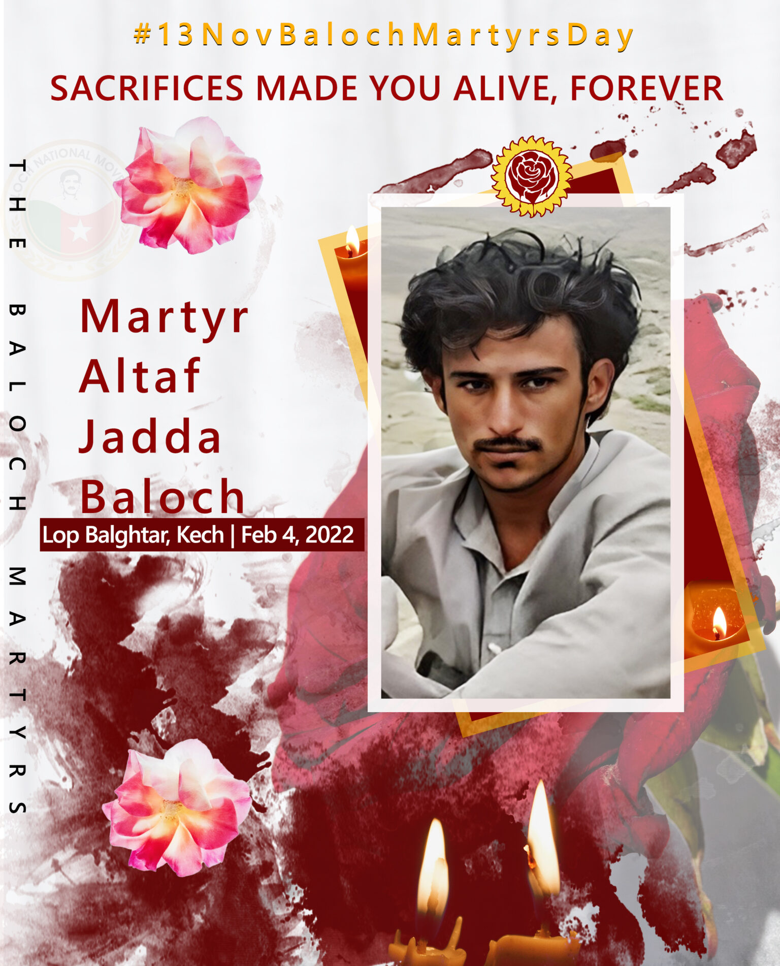 13 Nov Baloch Martyrs DayFebruaryPostersMartyr Altaf Jadda Baloch Last updated: November 12, 2023 9:32 am BNM Share 0 Min Read Martyr Altaf Jadda Baloch SHARE Sacrifices Made You Alive, Forever.Resident of Lop Balgtar, area of KechDate of Martyrdom: Feb 4, 2020 Martyr Hakeem Baloch Tribute the Baloch Martyrs Martyr Batey Khan Baloch Martyar Meer Jan Meeral Martyr Abbas Baloch TAGGED:#13NovBalochMartyrsDay#Baloch#Balochistan#BalochMartyrs Share This Article Facebook Whatsapp Whatsapp Telegram Email Copy Link Print Leave a Comment Leave a Comment Leave a ReplyYour email address will not be published. Required fields are marked *Comment *Name Email Website Δ