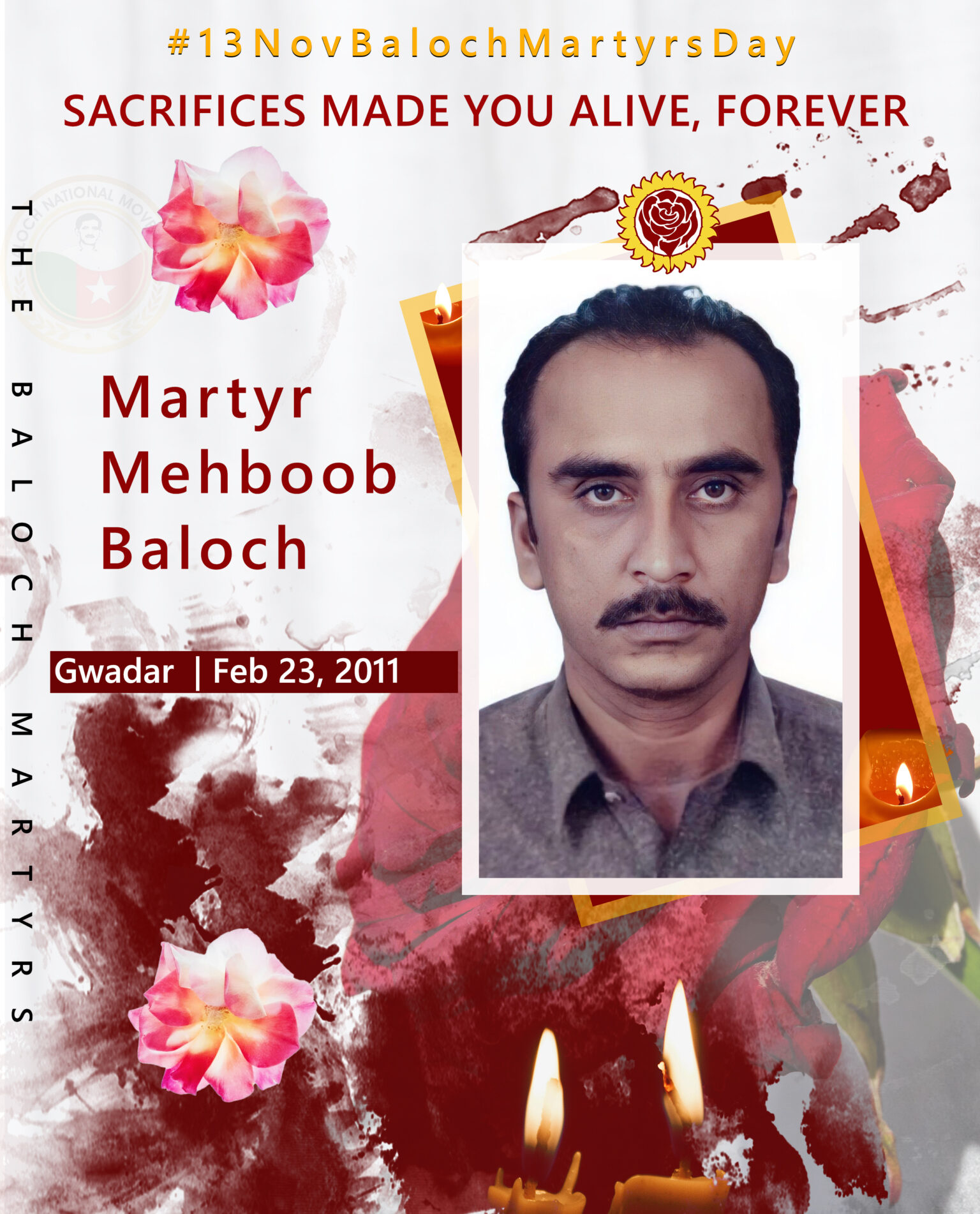 13 Nov Baloch Martyrs DayBNMFebruaryGwaderPostersMartyr Mehboob Baloch Last updated: November 12, 2023 2:59 pm BNM Share 0 Min Read Martyr Mehboob Baloch SHARE Sacrifices Made You Alive, ForeverResident of GwadarDate of martyrdom: Feb 23, 2011 Martyr Dil Shad Baloch Martyr Nizar Baloch Tribute Martyr Mayar Baloch Martyr Asad Baloch Martyr Abdullah Baloch TAGGED:#13NovBalochMartyrsDay#Baloch#Balochistan#BalochMartyrs#Gwadar Share This Article Facebook Whatsapp Whatsapp Telegram Email Copy Link Print Leave a Comment Leave a Comment Leave a ReplyYour email address will not be published. Required fields are marked *Comment *Name Email Website Δ