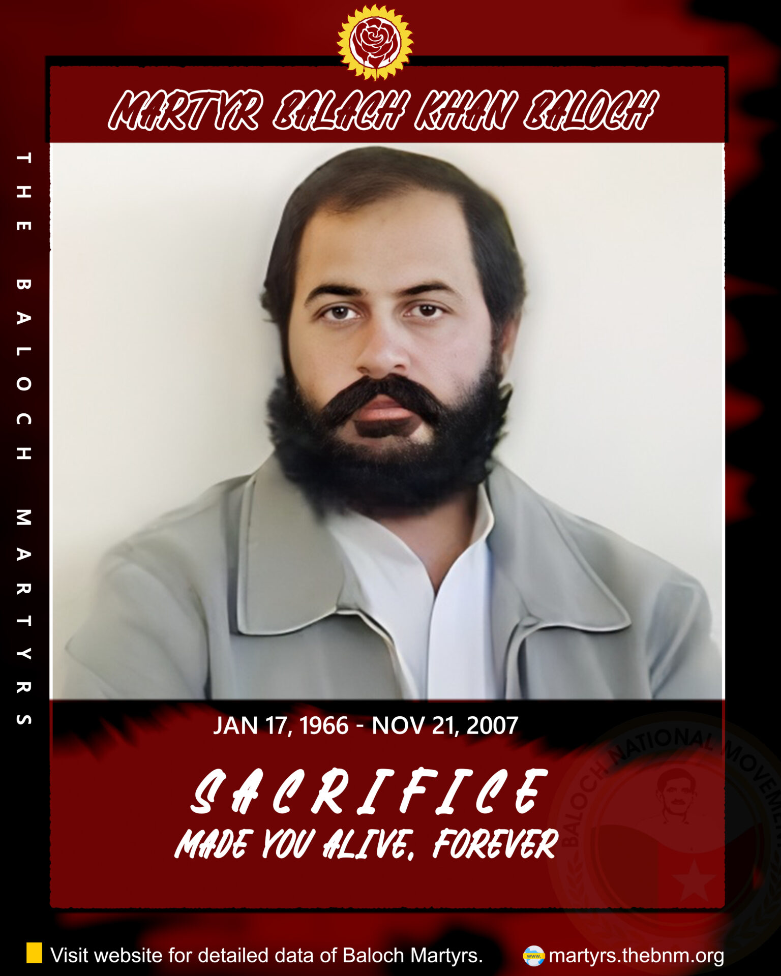 Balach Khan was a man of action rather than revering on national rhetoric. He was well-educated and had derived from the studies of other movements of the world that the militant front was inevitable in the struggle against Pakistan. Instead of playing only rhetoric with the emotions of the nation, he opted the path of resistance and made his homes in the mountains, and resisted the Pakistani army for many years. He embraced martyrdom on Nov 21, 2007