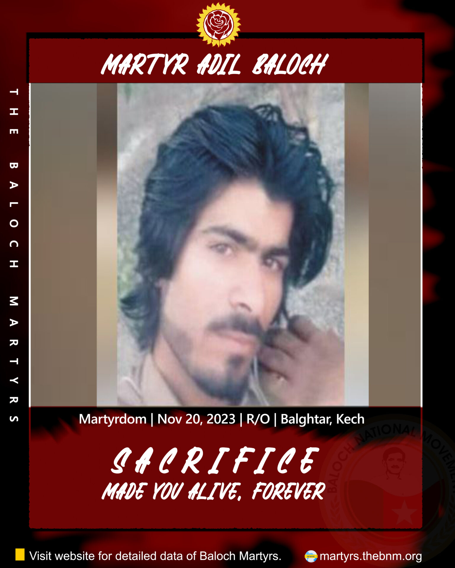 Martyr Adil Baloch Son of Assa Baloch and was a resident of Balghtar, Kech. He was abducted along his brother Shah Jan and other six closed relatives from different areas on Aug 22, 2023. After four months, on Nov 20, 2023, he was killed along with brother Shah Jan and relative Nabi Dad son of Lewari Baloch by Pakistan military backed death squad in Balghtar, Kech.