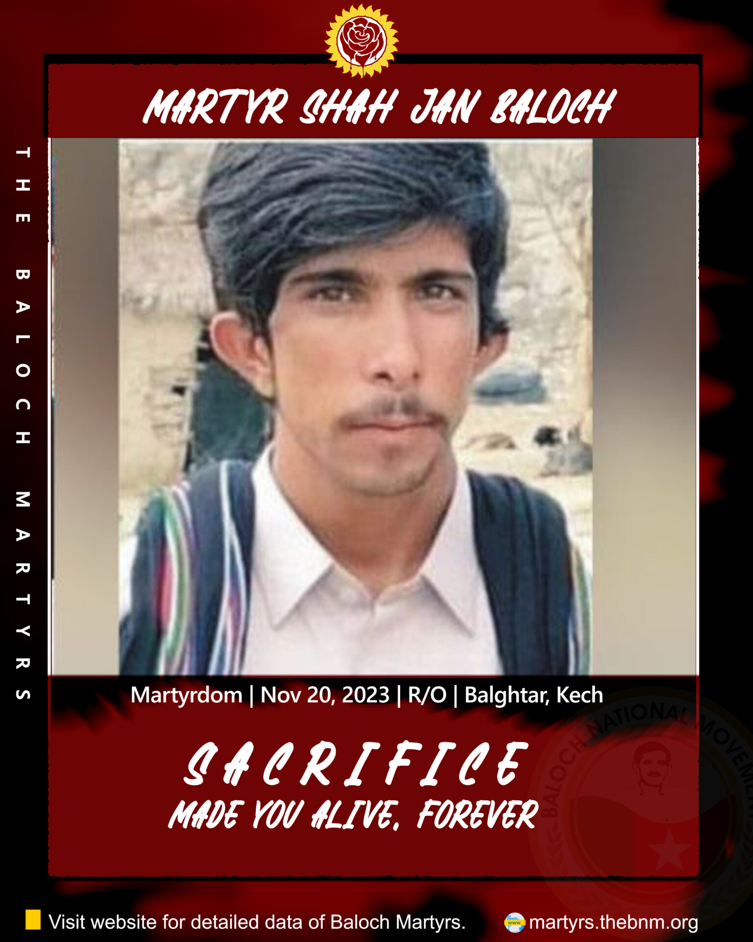 Martyr Shah Jan Baloch Son of Assa Baloch and was a resident of Balghtar, Kech. He was abducted along his brother Adil and other six closed relatives from different areas on Aug 22, 2023. After four months, on Nov 20, 2023, he was killed along with brother Adil and relative Nabi Dad son of Lewari Baloch by Pakistan military backed death squad in Balghtar, Kech.Β