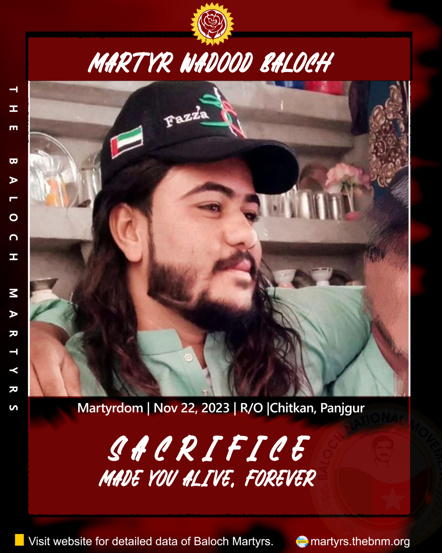 Martyr Wadood Baloch was a resident of Chitkan, Panjgur. He was abducted by Pakistani forces in on April 27, 2023 in Turbat area of Kech. After eight months, on Nov 22, 2023, He was killed by CTD in Fake encounter along with three people, Balach Baloch, Shakoor Baloch and Saif Baloch in Banuk Chadahi, Turbat area of Kech, Balochistan.