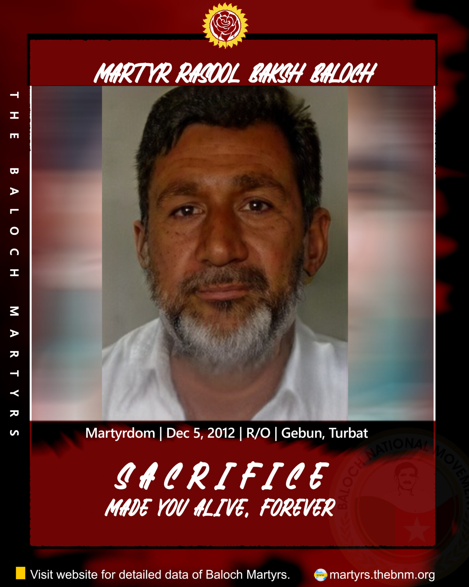 Martyr Rasool Baksh Baloch was a resident of Gebun, area of Turbat, Kech. He was affiliated with a pro-independence armed organization, Balochistan Liberation Front (BLF) for years.