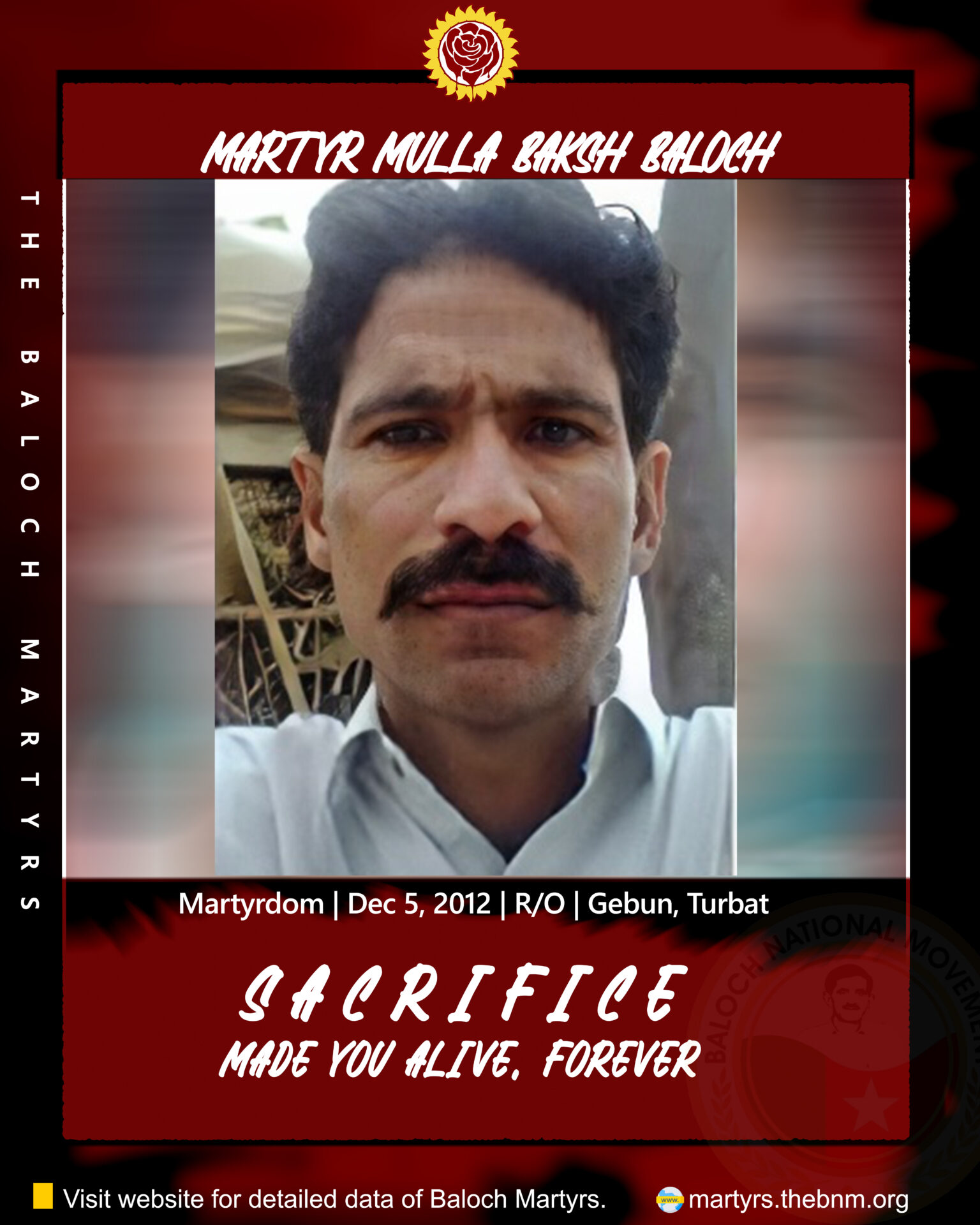Martyr Mulla Baksh Baloch was a resident of Gebun, area of Turbat, Kech. He was affiliated with a pro-independence armed organization, Balochistan Liberation Front (BLF) for years.