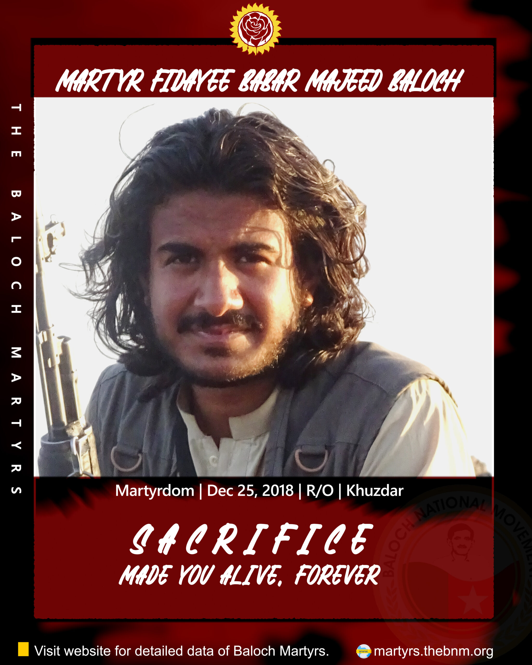 Martyr Babar Majeed Baloch alias Fareed Baloch was a resident of Khuzdar, Balochistan. He became part of Baloch liberation movement in the platform of Baloch Liberation Army (BLA) in 2012. He was one of member of BLAโs media team for years, also he was one of the Self-Sacrificing member of Majeed Brigade. When enemy person want to target General Aslam Baloch, Babar Baloch hugged the General to protect him. This attack of enemy, Babar Baloch along with General Aslam Baloch, Kareem Baloch, Akhtar Baloch, Taj Muhmmad Baloch and Aman Ullah Baloch on Dec 25, 2018.ย