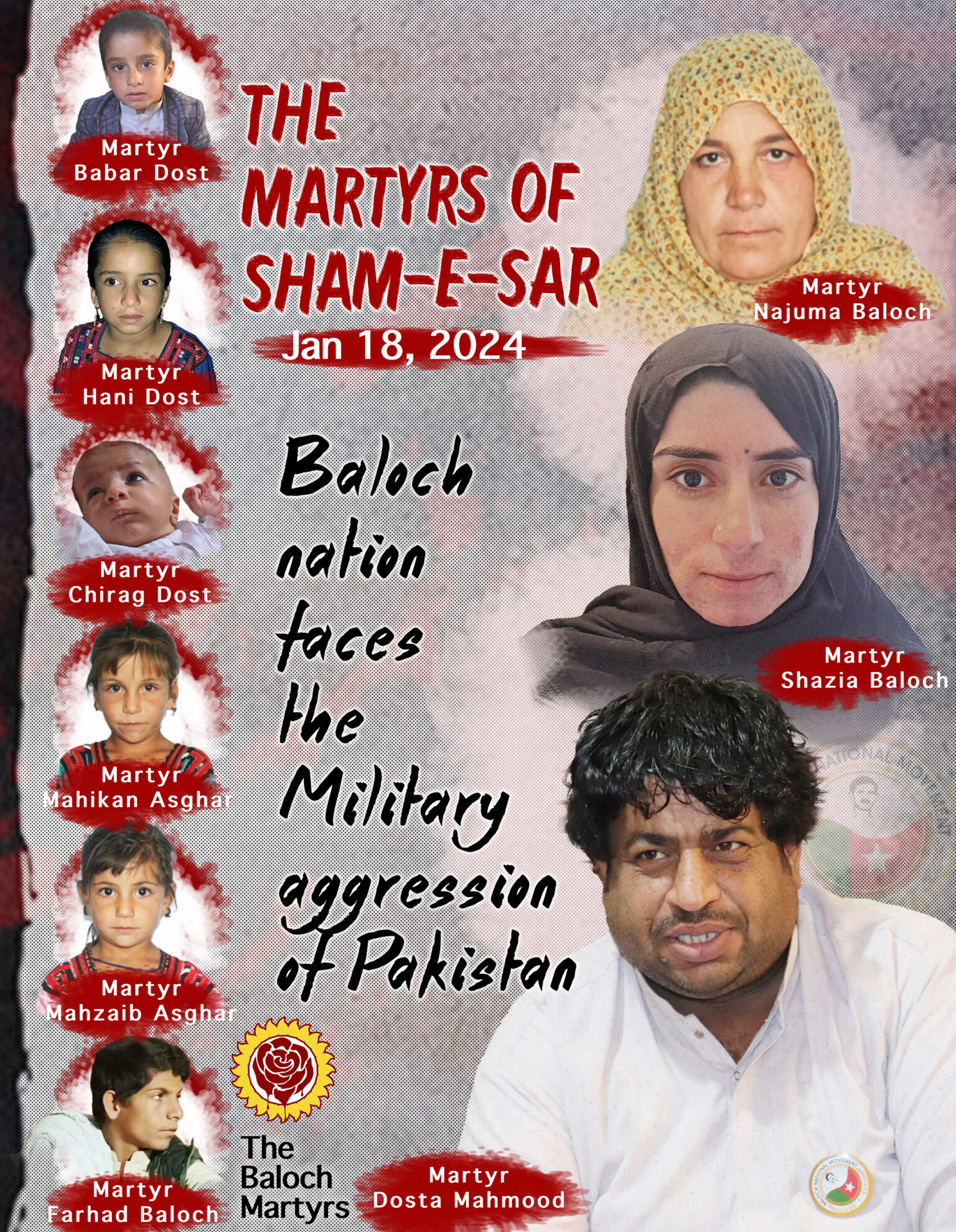 Pakistan attacked with missiles and suicide drones on houses of Baloch refugees on Jan 18, 2024 in Sham-E-Sar (Haqqabad), sistan and Balochistan where BNM senior member Dosta Mahmood Baloch along with his wife Shazia Baloch, daughter Hani Dost, Sons Babar Dost, Chirag Dost and other four people Najuma Baloch, Mahikan Asghar, Mahzaib Asghar and Farhad Baloch.Β