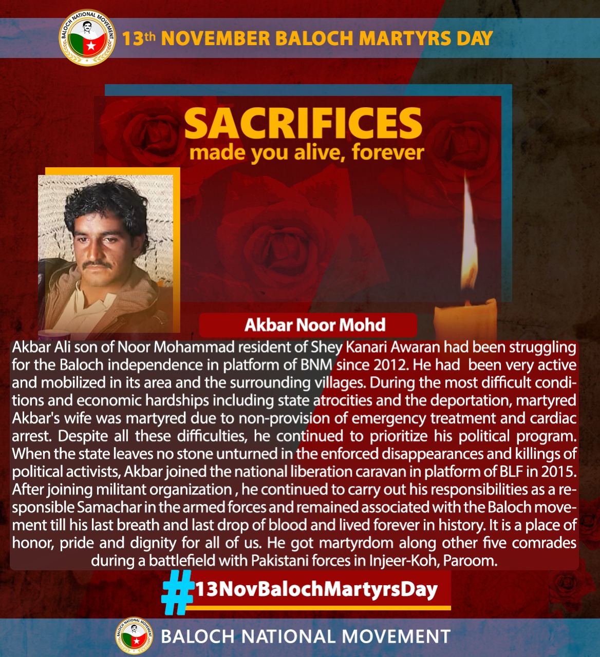 Akbar Ali, son of Noor Mohammad from Shey Kanari, Awaran, began his struggle for Baloch independence through the platform of the Baloch National Movement (BNM) in 2012. He was highly active in his area, mobilizing support in surrounding villages. Despite severe hardships, including state violence, forced displacement, and the tragic loss of his wife due to lack of emergency medical care, Akbar remained committed to his political mission. As the state intensified enforced disappearances and killings of political activists, Akbar joined the national liberation movement through the Baloch Liberation Front (BLF) in 2015. As a dedicated Samachar, he fulfilled his duties with unwavering resolve, remaining committed to the Baloch cause until his last breath. His legacy stands as a symbol of honor, pride, and dignity for all. Akbar embraced martyrdom alongside five comrades in a battle with Pakistani forces in Injeer-Koh, Paroom.