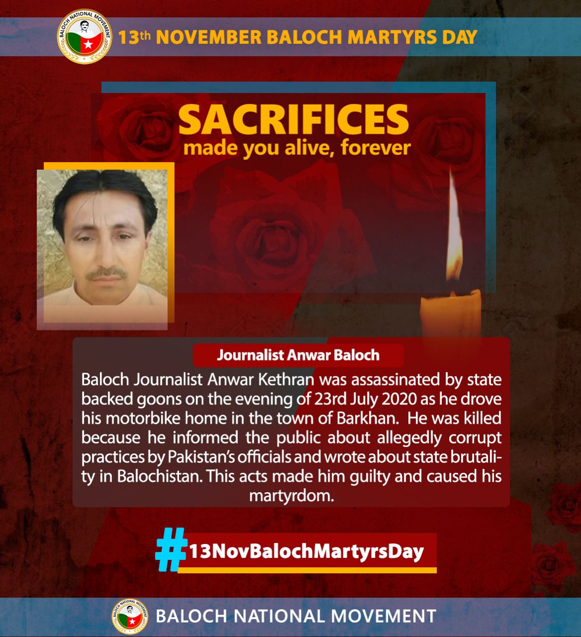 Baloch journalist Anwar Kethran was assassinated by state-backed assailants on the evening of July 23, 2020, while riding his motorbike home in Barkhan. He was targeted for exposing alleged corruption by Pakistani officials and for documenting state brutality in Balochistan. His commitment to truth and justice ultimately led to his martyrdom.