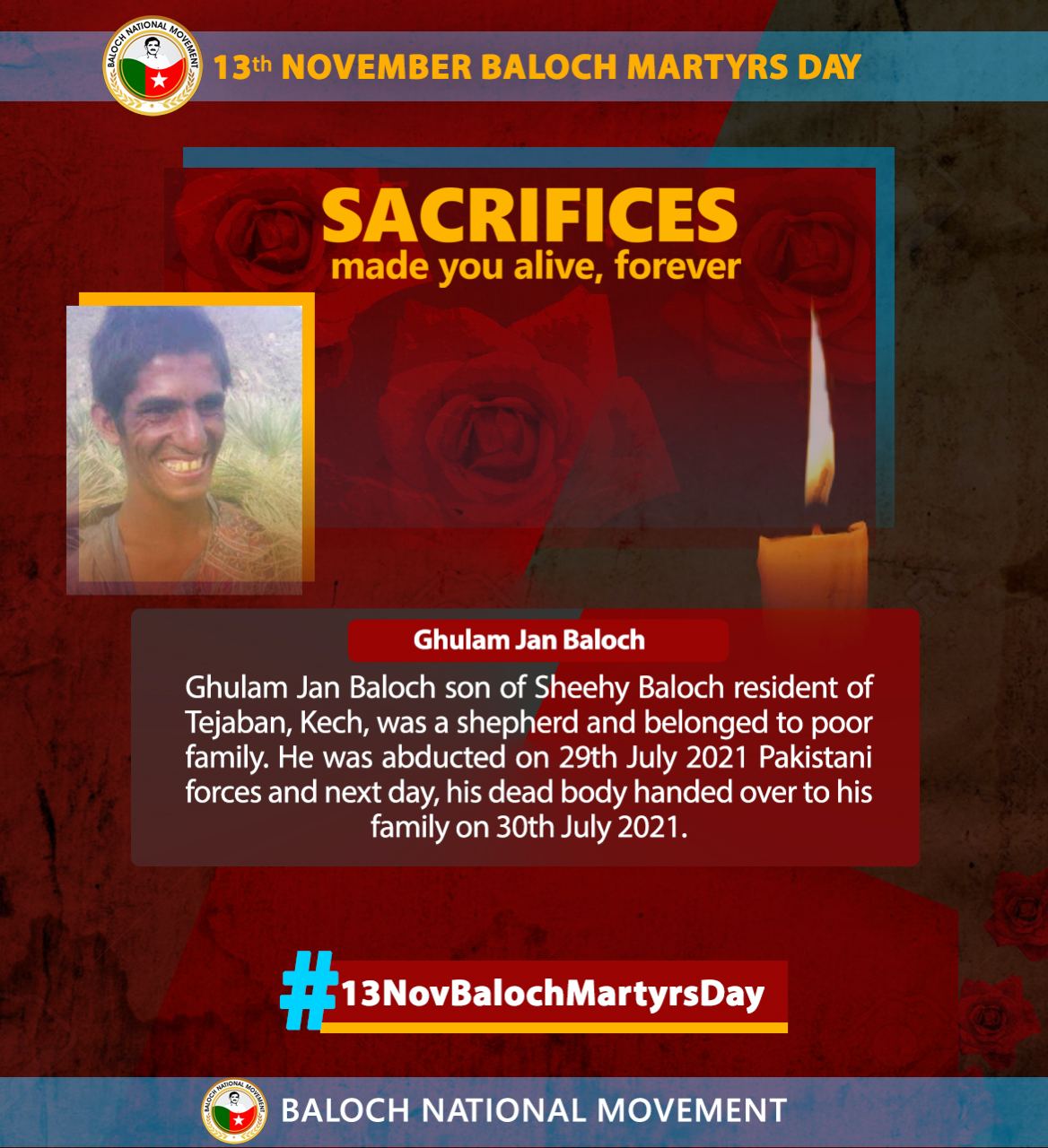 Ghulam Jan Baloch, son of Sheehy Baloch and a resident of Tejaban, Kech, was a shepherd from a poor family. He was abducted by Pakistani forces on July 29, 2021, and the following day, on July 30, his body was returned to his family.