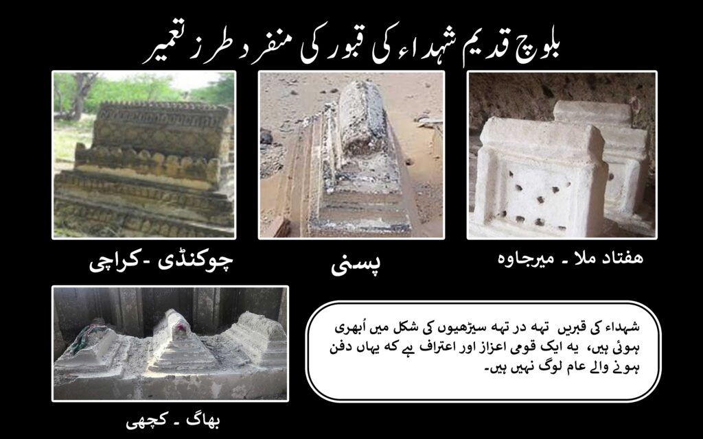 در مناطق مختلفِ گلزمینِ بلوچ — مانندِ گوادِر، بولان، میرجاوَہ و توتا چوکُنڈی (کراچی) — قبورِ متعددی از رزمندگانِ بلوچ وجود دارد که جانِ خود را در دفاع از سرزمینشان در برابرِ حملهگرانِ بیرونی فدا کردهاند.